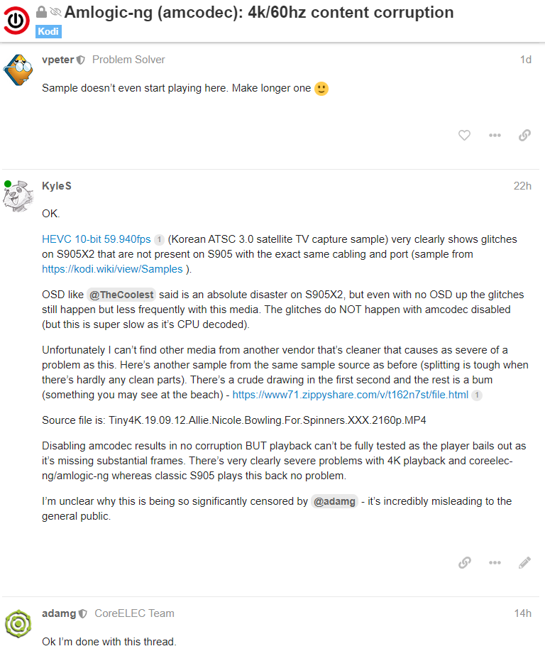 Device trees: The mainline kernel avoids the silliness of 1G/2G/3G variants needed on the legacy kernel which makes life easier, but we will still need to figure out (and then upstream) the device trees for popular devices. I'm keen that device trees are sent upstream so that devices can be uniquely identified by "compatible" strings in the device-tree, as this allows simple things like the remote control keymap (also sent upstream) to be described in the device-tree for a better out of box user experience. Submitting changes to the kernel is not the most straightforward process but if non-coding folk like myself can figure it out (my personal collection of one-line kernel changes is slowly increasing) the bar is not set impossibly high.