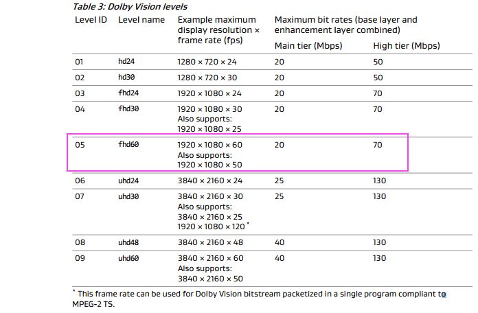 I had a quick look at Dolby Vision Profiles and Levels and found the following