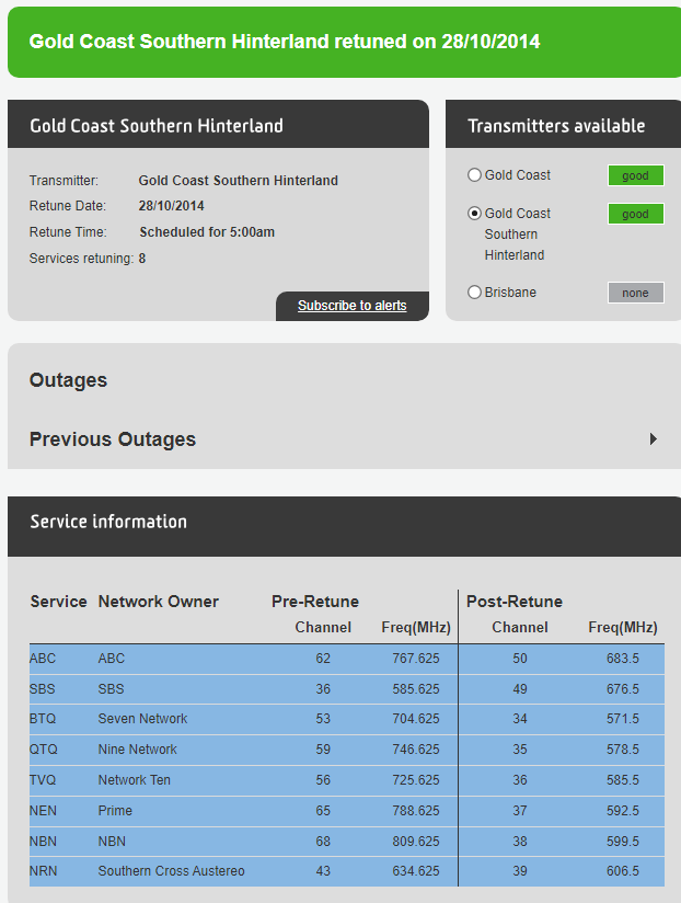 This shows that this Gold Coast transmitter, Mount Tamborine, is in a UHF area, with SBS's mux on 613.5MHz, ABC's on 620.5MHz, Seven's on 627.5MHz, Nine's on 648.5MHz, Ten's on 641.5MHz and (not on the screen shot) Prime's on 655.5MHz, NBN's on 662.5MHz and Southern Cross's on 669.5MHz.