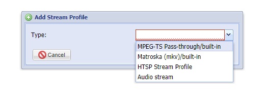 I assume I click on Stream Tab, then Stream Profile, then click green + button which open an Add Stream Profile window. From here the only options in drop down are Mpeg-TS Pass-through/built-in Matroska (mkv) built-in, HTSP Stream Profile and Audio Stream (HTSP Stream Profile is only visible now I have selected Expert view)