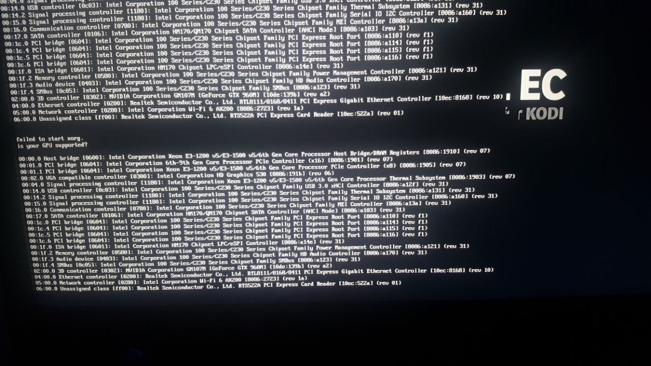 Display MoreScreen 0: minimum 8 x 8, current 1920 x 1080, maximum 32767 x 32767 eDP1 connected primary 1920x1080+0+0 (normal left inverted right x axis y axis) 340mm x 190mm 3840x2160 60.00 + 59.97 48.00 3200x1800 59.96 60.00 59.94 2880x1620 60.00 59.96 59.97 2560x1600 59.99 59.97 2560x1440 59.96 60.00 59.95 2048x1536 60.00 1920x1440 60.00 1856x1392 60.01 1792x1344 60.01 2048x1152 60.00 59.90 59.91 1920x1200 59.88 59.95 1920x1080 59.96 60.00* 59.93 1600x1200 60.00 1680x1050 59.95 59.88 1600x1024 60.17 1400x1050 59.98 1600x900 60.00 59.95 59.82 1280x1024 60.02 1440x900 59.89 1400x900 59.96 59.88 1280x960 60.00 1368x768 60.00 59.88 59.85 1360x768 59.80 59.96 1280x800 59.81 59.91 1152x864 60.00 1280x720 59.86 60.00 59.74 1024x768 60.00 1024x576 60.00 59.90 59.82 960x540 60.00 59.63 59.82 800x600 60.32 56.25 864x486 60.00 59.92 59.57 640x480 59.94 720x405 59.51 60.00 58.99 640x360 59.84 59.32 60.00 HDMI1 disconnected (normal left inverted right x axis y axis) VIRTUAL1 disconnected (normal left inverted right x axis y axis)it says disconnected on HDMI1, my suspicion is that it's related to the fact the laptop has 2 GPUs, one that's built-in to the CPU and one discreet, and that I need some sort of tweak to tell LibreELEC to talk with the GeForce one.