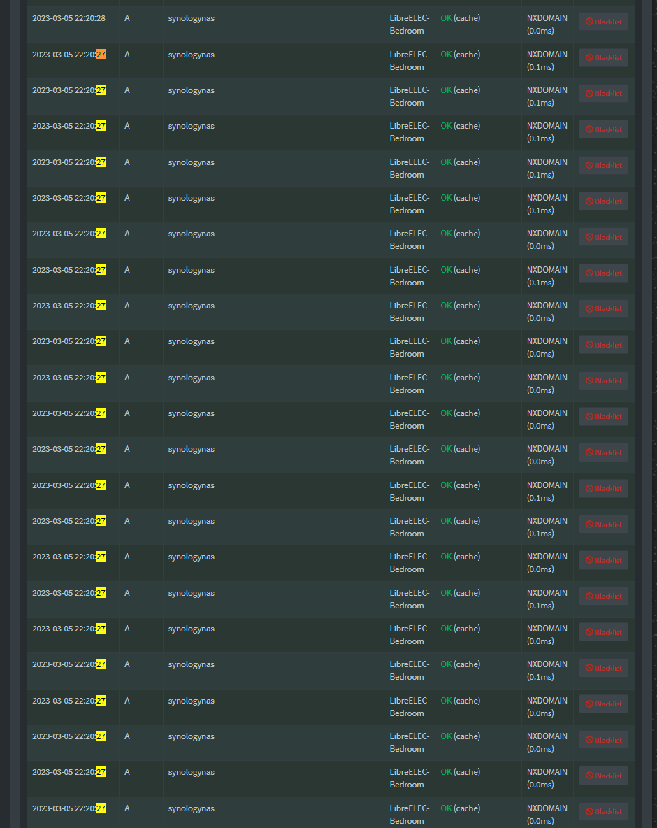 The screenshot in your first post is showing that your PiHole received a DNS A (address) request for "synologynas" and responded with NXDOMAIN (no address) - so your PiHole doesn't know anything about a "synologynas" host in your LAN.