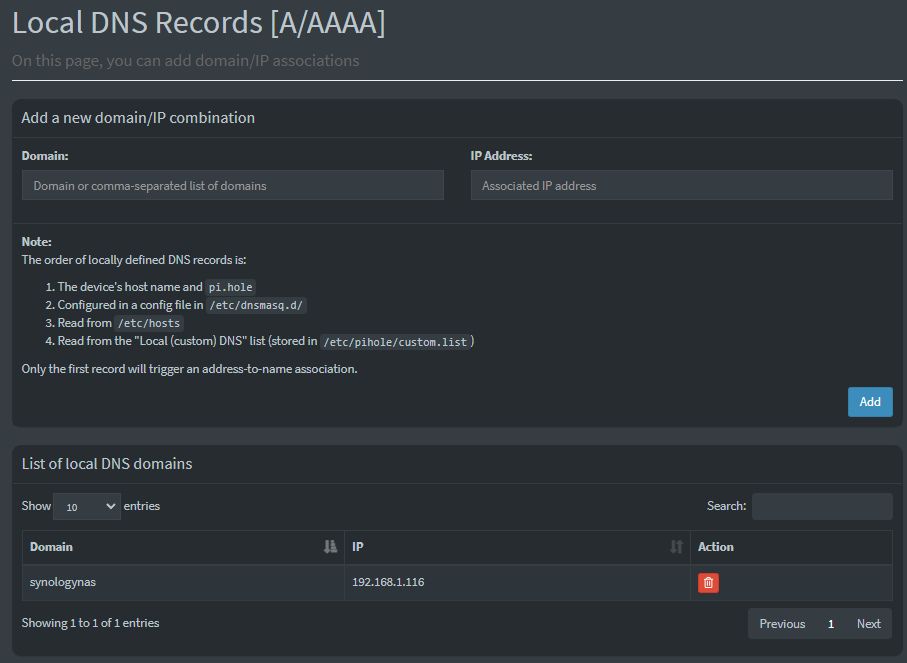 You may want to add your local domain name (eg ".lan") to the source hostname (eg "synologynas.lan") and make sure PiHole resolves the name to the IP correctly.