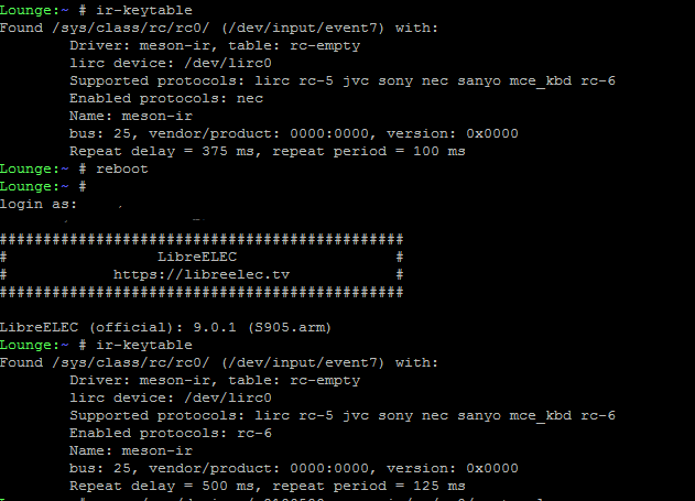Lordjontan : I put your files (m8s and rc_maps.cfg) in the specific folders and executed ir-keytable -a /storage/.config/rc_maps.cfg -s rc0 and ir-ctl -t 50000 and ir-keytable -D 375 -P 100