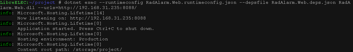 Display More[Unit] Description=RadAlarm.Web - ASP.NET Core App based on radiation detector and ESP32 controller [Service] WorkingDirectory=/storage/project ExecStart=/storage/.kodi/addons/tools.dotnet-runtime/bin/dotnet exec --runtimeconfig RadAlarm.Web.runtimeconfig.json --depsfile RadAlarm.Web.deps.json RadAlarm.Web.dll --urls=http://192.168.31.235:8088/ Restart=always RestartSec=10 SyslogIdentifier=RadAlarmLog User=root KillSignal=SIGINT Environment=ASPNETCORE_ENVIRONMENT=Development Environment=DOTNET_PRINT_TELEMETRY_MESSAGE=false Environment=HOME=/root [Install] WantedBy=multi-user.targetthe service will not start with this configuration