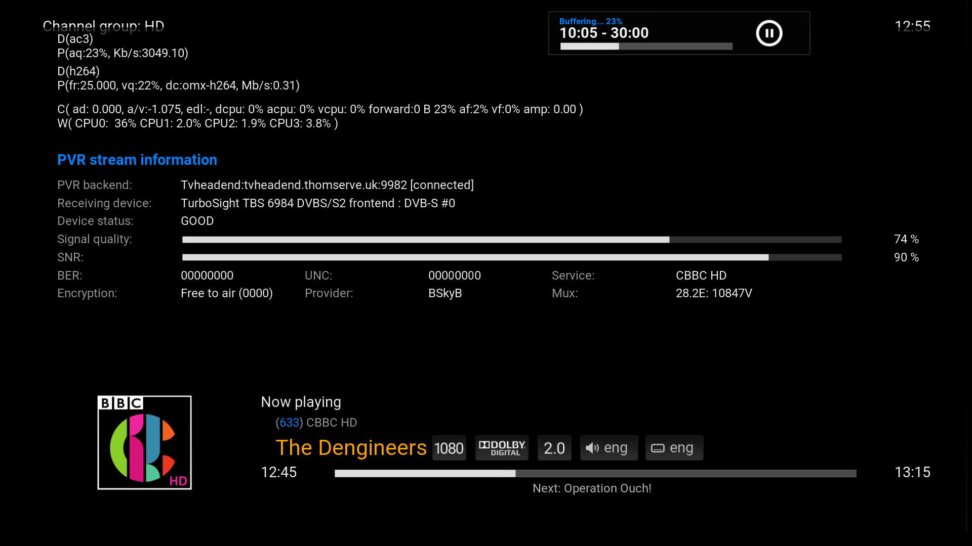 Certain channels (namely the BBC Olympic HD channels and CBeebies HD) return only a blank screen. I can see that data is being served to the client (via HTSP) from TVHeadend but no sound/video is displayed. If I show the stats overlay on top of the blank screen, it shows that Kodi is receiving data (including the bitrate of the stream) but there are no match/phase/pll stats for the channel.
