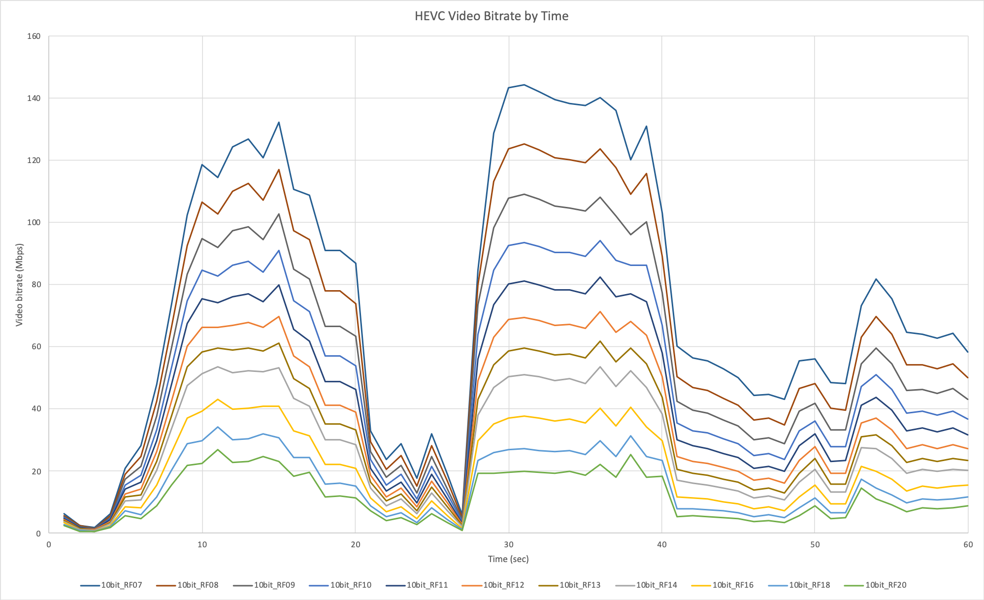 You can see the bitrates of the encoded video files by time on the attached chart. The bitrate was calculated using ffprobe.