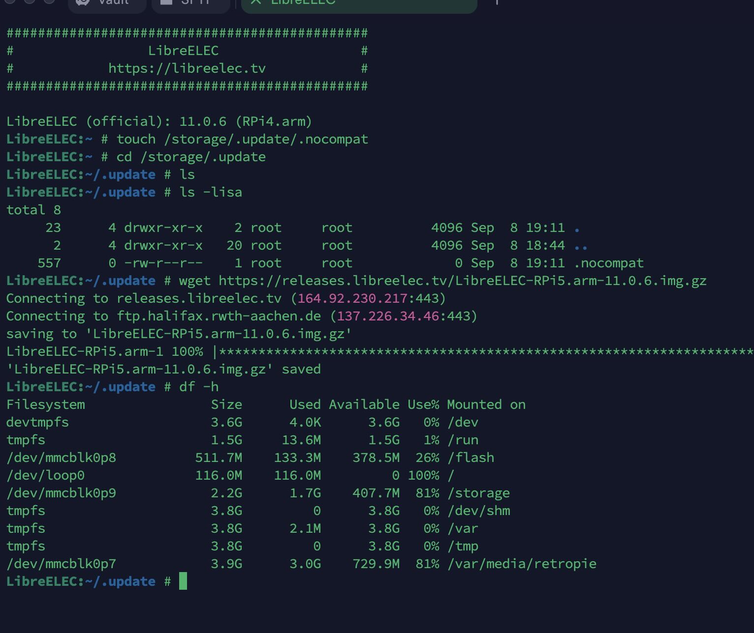 Codetouch /storage/.update/.nocompat cd /storage/.update wget https://releases.libreelec.tv/LibreELEC-RPi5.arm-11.0.6.img.gz rebootOn reboot the RPi4 updates to the RPi5 image, and on completion and second reboot it attempts to boot the RPi5 image. This will either fail or half-work so it's best to pull power on the RPi4 as the second reboot starts. Now transfer the SD card to the RPi5 and things should work.