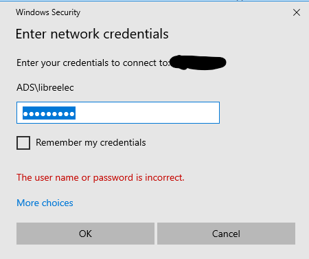 If I enter the right credentials, libreelec/libreelec I get an error (password incorrect)