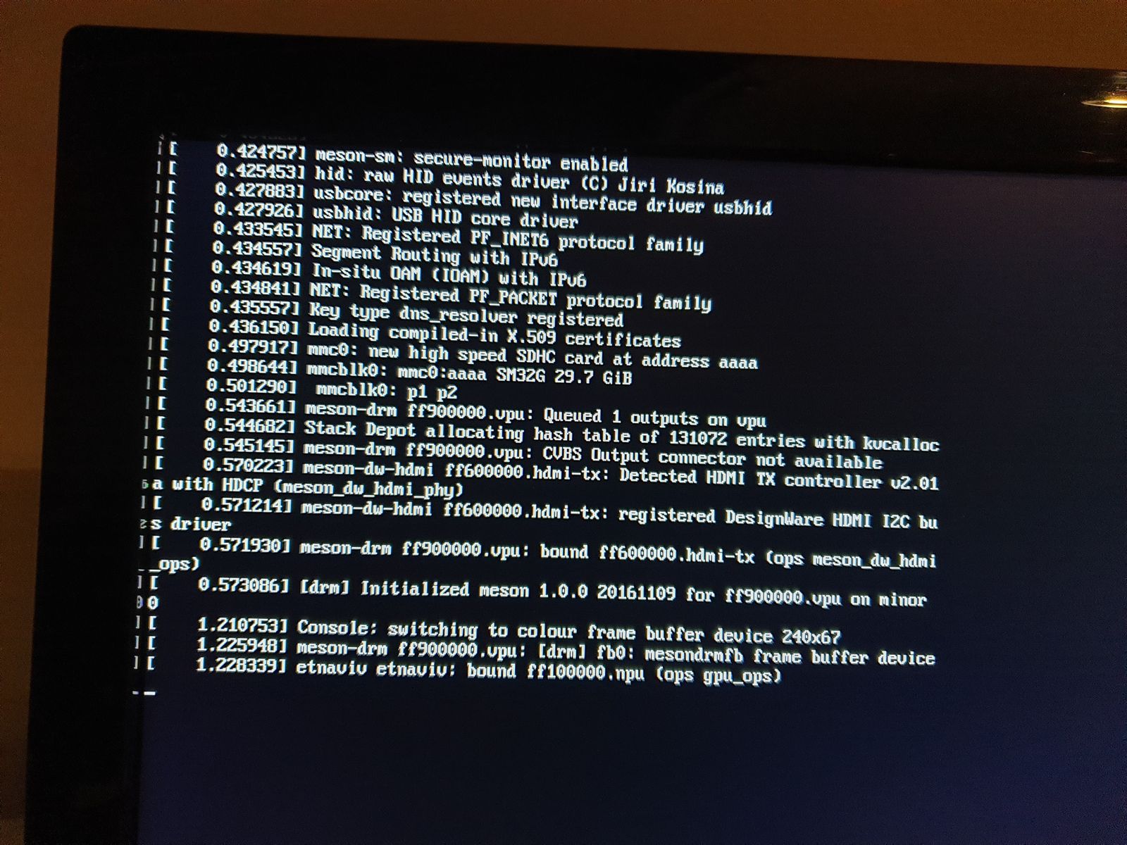 Without power or ground on the microUsb (terminal), the hardware writes a few characters "MC: .." when the chain boot loader is started.
