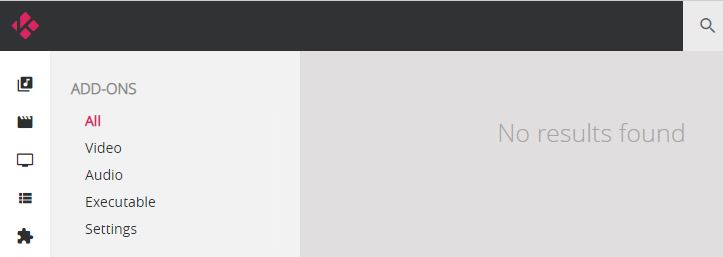 Then I click on addons, it says "No results found", see attached screenshot. LibreELEC add-ons are enabled, though.