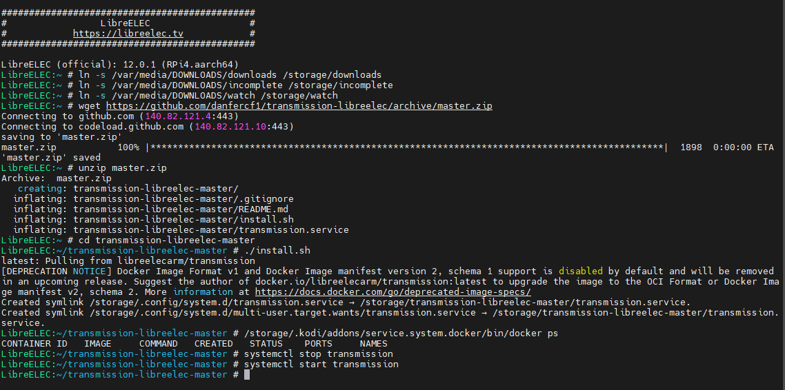 GitHub - danfercf1/transmission-libreelecContribute to danfercf1/transmission-libreelec development by creating an account on GitHub.github.comI think I could install the docker addon (from Libreelect repository), create the symlinks, download the project and install it (I can see a deprecation warning but I don't know if this was a problem).