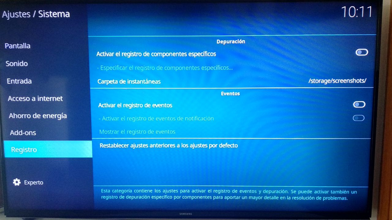 Display More2019-04-11 18:28:39.949 T:3011788816 NOTICE: Loaded settings file from special://profile/advancedsettings.xml 2019-04-11 18:28:39.949 T:3011788816 NOTICE: Contents of special://profile/advancedsettings.xml are... <advancedsettings> <cache> <memorysize>139460608</memorysize> <buffermode>1</buffermode> <readfactor>20</readfactor> </cache> <loglevel>2</loglevel> </advancedsettings> 2019-04-11 18:28:39.949 T:3011788816 NOTICE: Log level changed to "LOG_LEVEL_DEBUG_FREEMEM" 2019-04-11 18:28:39.949 T:3011788816 WARNING: CSettingsManager: missing version attribute 2019-04-11 18:28:39.950 T:3011788816 NOTICE: Default Video Player: VideoPlayer 2019-04-11 18:28:39.950 T:3011788816 NOTICE: Default Audio Player: paplayer 2019-04-11 18:28:39.950 T:3011788816 NOTICE: Disabled debug logging due to GUI setting. Level 1.And here is a snapshot where all the log stauff is properly disabled (Sorry, it is in spanish but at leasy I think that you can recognize the screen and see that all is disabled). What I'm doing wrong?