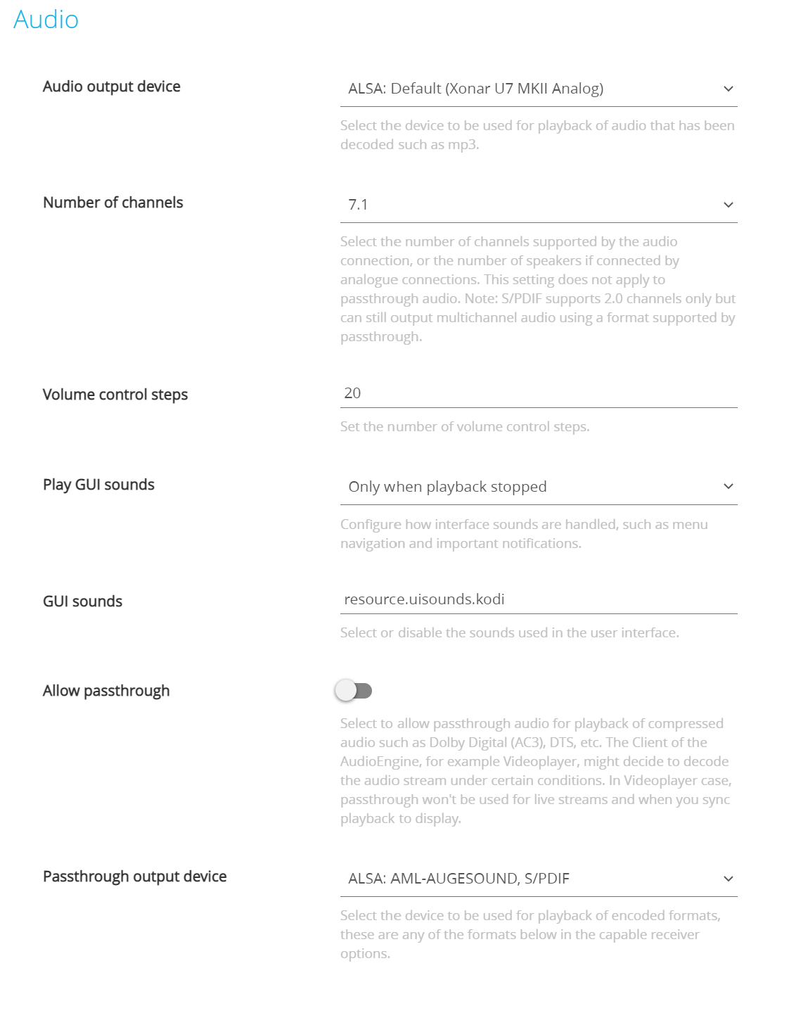 I have an issue I haven't been able to fix. The usb sound card [asus xonar u7 mkii] when selected to output analog 7.1 in kodi only outputs analog stereo.