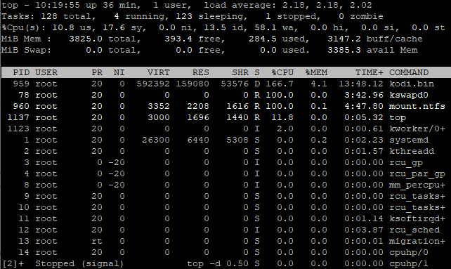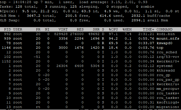 Going by top, no swapping seems to be actually taking place (MiB Swap = 0.0). Also, reported memory usage by Kodi never exceeds 750MB. Is there anything I can do on my end to prevent those spikes in CPU usage as a workaround? My first idea was to reformat the external HDD to a Linux-compatible format, but that would break compatibility with my TV and other devices. The other obvious solution seems to be to deactivate the swapping service. Although I think that I have enough RAM available to not require swapping, this seems to be not advisable by the sources I found. But may be those spikes are just the symptom of an underlying problem.