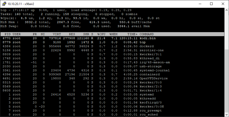 I also tested 1080p footage and the same issue occurs, albeit less intense. Usually, when playing 1080p, CPU usage hovers between 30 to 40%, but I was able to screenshot a spike where all services hit 100% or higher. The playback recovers much faster and no buffering circle is triggered, but the playback is jerky every few seconds to a point where it's no fun watching at all.Update: For testing purposes I also gave LibreElec 9.2.7 a shot (no overclock this time). None of the issues occured. 1080p and 4k playback was smooth. CPU usage was around 25% for 1080p and 50% to 60% for 4k. While the playback is dead stable, unfortunately all colors for HDR/BT2020 content are way off making LE 10 the only viable option.
