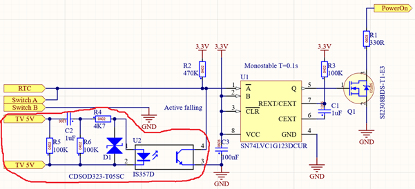 The components ringed in red allow 5V from a TV USB port to also wake the Pi up, with C2 limiting this to a pulse of 25ms into the monostable input on TV power-up. This is so that if you are watching something else other than Kodi the RTC can still wake Kodi up for a recording if Kodi halts with the TV on. These components can be omitted if this isn’t required.