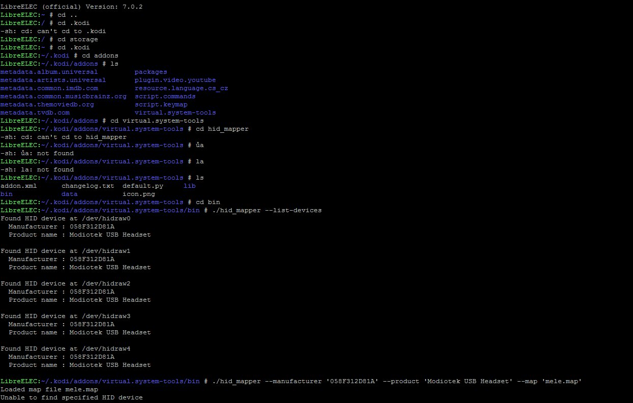 2.) Using evtest from kodi package I got the scancodes:CodeOpenELEC:~ # evtest No device specified, trying to scan all of /dev/input/event* Available devices: /dev/input/event0: 058F312D81A Modiotek USB Headset /dev/input/event1: 058F312D81A Modiotek USB Headset /dev/input/event2: 058F312D81A Modiotek USB Headset Select the device event number [0-2]:By selecting "0" and then pressing the buttons I wanted to map I found the codes to be: