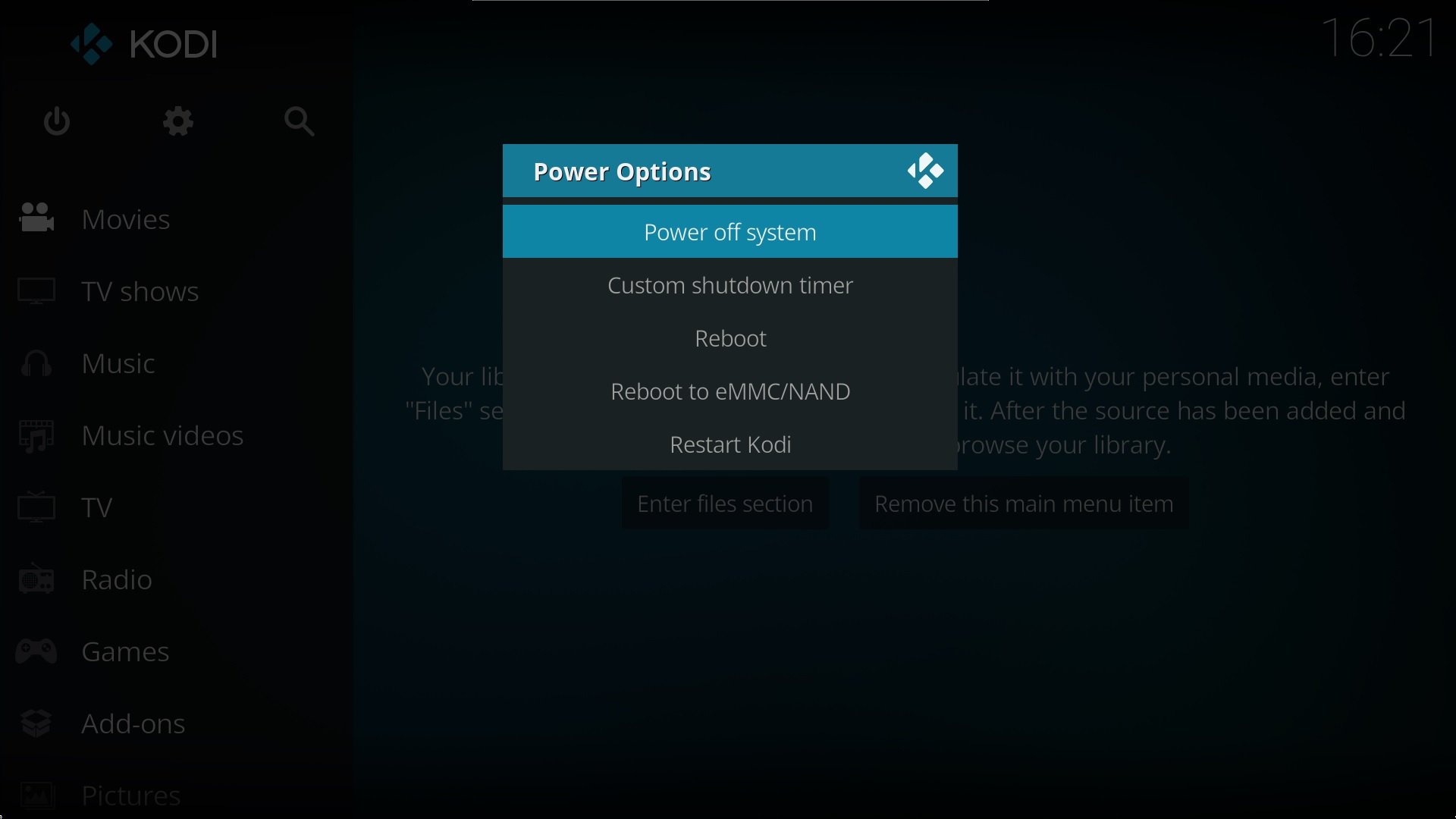Each Kodi skin uses its own powermenu config, so there's not much point in adding it to Estuary by default, not to mention that this menu item will appear in English on non-English languages as well, which is quite confusing for some users. I don't think you're using the Estuary skin either, because there's no Exit menu item under LE.