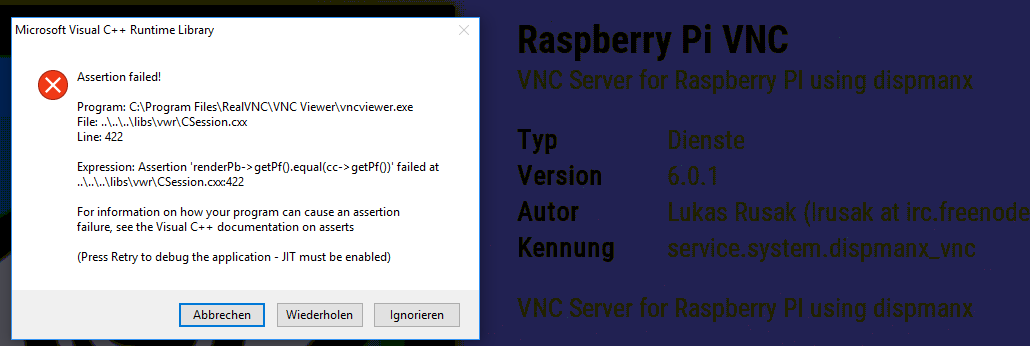 When i start the first connect from my Windows PC with RealVNC (v5.3.2) can i see one picture from the Pi. Then i became an error (see attachment).