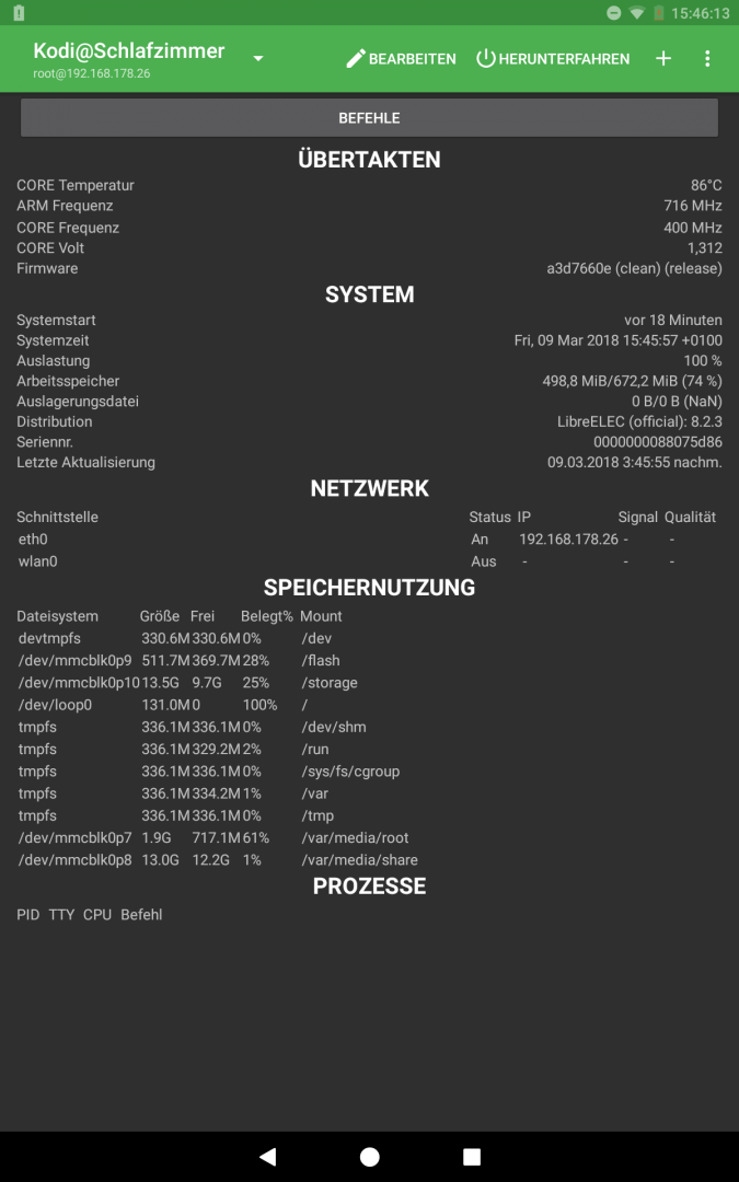Most of the time (including Playback) it runs at about 55 to 65°C which is ok. But in irregular time intervals CPU Load goes up and stays that way (when idle mostly), the PI runs at about 85°C (see Screenshot) and shows the overheating Symbol which is when I notice it. Rebooting it fixes that temporarily and Temp drops immediatelly to normal Ranges.