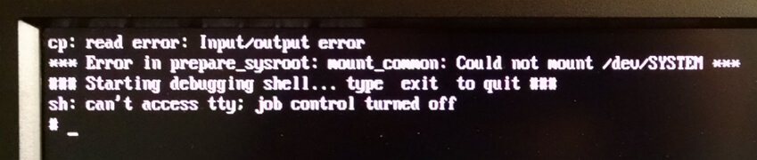 Codecp: read error: Input/Output error *** Error in prepare_sysroot: mount_common: Could not mount /dev/SYSTEM ### Starting debugging shell... type exit to quit ### sh: can't access tty; job control turned ofAfter this I tried a clean install via toothstick from another SD card which works.