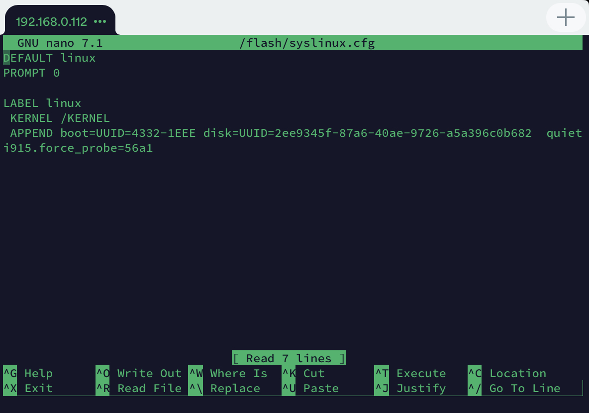 Add i915.force_probe=56a1 to syslinux.cfg